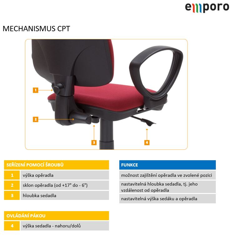 | druh mechaniky Všechny kancelářské otočné židle jsou výškově stavitelné pomocí plynového pístu. Dále rozlišujeme 4 základní druhy mechanismů: | permanentní kontakt Sedadlo je fixně ve vodorovné poloze, bez možnosti nastavení sklonu. Sklon opěradla je nastavitelný. Pokud opěradlo není zaaretované, volně se odklání a přes pružinu je permanentně v kontaktu se zády uživatele. |